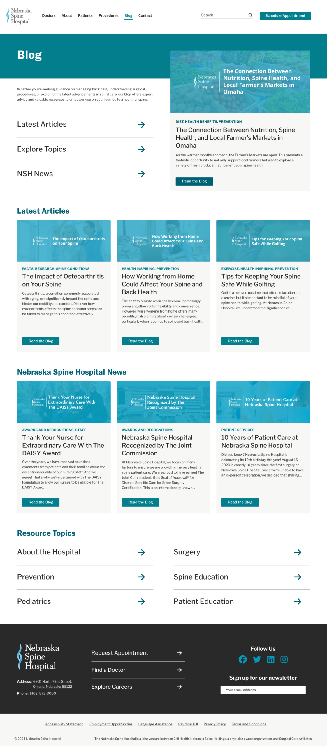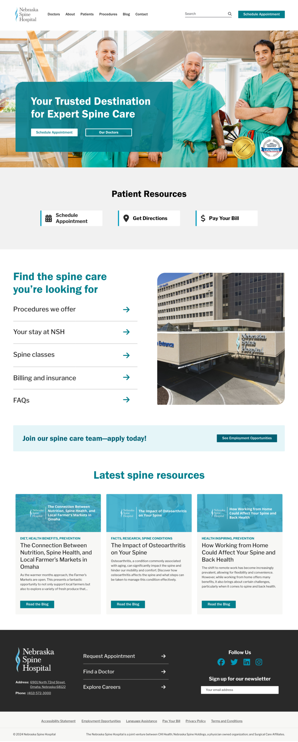 Nebraska Spine Hospital needed a modern, user-friendly website to help patients easily access essential information. I led the full website redesign, focusing on clean layouts, intuitive navigation, and clear call-to-actions. Alongside this, I refreshed the brand’s visual identity and updated all supporting print materials to match the new direction. I also created branded materials for their Employee Week, helping celebrate staff while reinforcing internal culture. The result is a cohesive, accessible brand experience for patients, caregivers, providers, and staff alike.